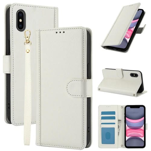 Funda de Cuero para iPhone X/Xs con Ranuras para Tarjetas y Cordón Doble (Blanco)