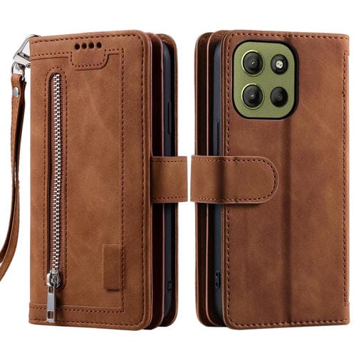 Funda de Cuero con Cremallera y Cordón para Motorola Moto G05 Nine Card (Marrón)
