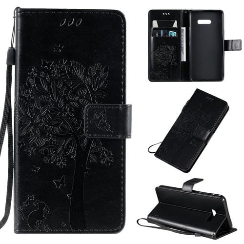 Estuche de Cuero PU para LG G8X con Diseño Árbol y Gato, Soporte, Ranuras y Cordón (Negro)