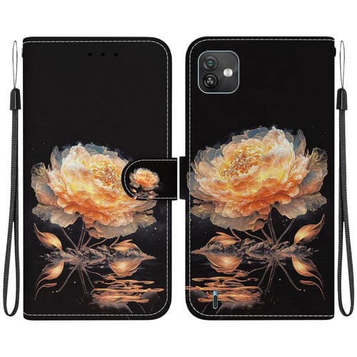 Estuche de Cuero para Wiko Y82 con Dibujo Coloreado y Textura de Cristal (Peonía Dorada)
