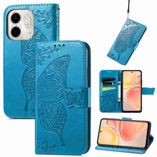 Funda de Cuero con Relieve Mariposa y Flor para Infinix Smart 9 (Azul)