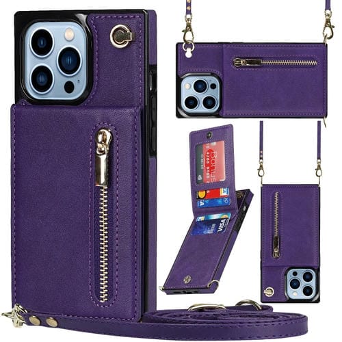 Caja de Telefonía Cuadrada con Cremallera Cruzada con Soporte para iPhone 13 Pro (Púrpura)