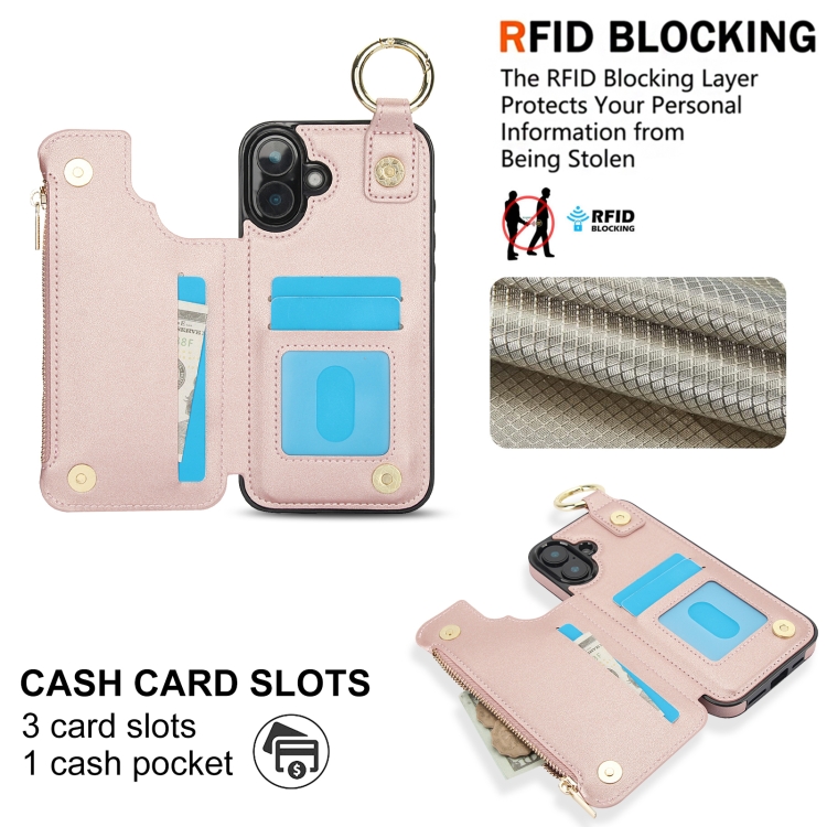 Estuche para Teléfono iPhone 16 Rfld con Cremallera y Anillo de Doble Hebilla Antirrobo (Oro Rosa)