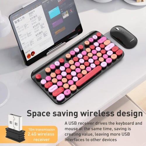 El Conjunto Inalámbrico Forev FFVWI9 incluye un Teclado y un Mouse diseñados para ofrecer una experiencia Portátil y eficiente con Conexión 2.4G. Este kit es compatible con una amplia variedad de dispositivos que soportan tecnología Inalámbrica estándar, facilitando la interacción sin Cables. El Teclado de 75 teclas presenta un diseño ergonómico con teclas de estilo retro tipo máquina de escribir que proporcionan una sensación mecánica realista y un sonido ligero y silencioso gracias a su tecnología de película delgada. El Mouse cuenta con una resolución de 1000 DPI, ideal para tareas diarias y navegación precisa. Ambos dispositivos funcionan con Baterías estándar (Teclado con dos AAA y Mouse con una AA), asegurando un voltaje de operación de 3V y una durabilidad de hasta un millón de pulsaciones por tecla.