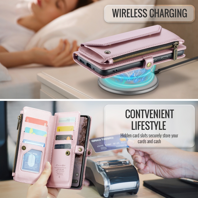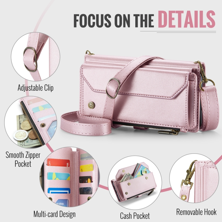 6. 10 ranuras para tarjetas + 2 posiciones para clip de dinero + 1 bolsa con cremallera + correa de hombro larga con cordón + correa de mano corta (real según la imagen)