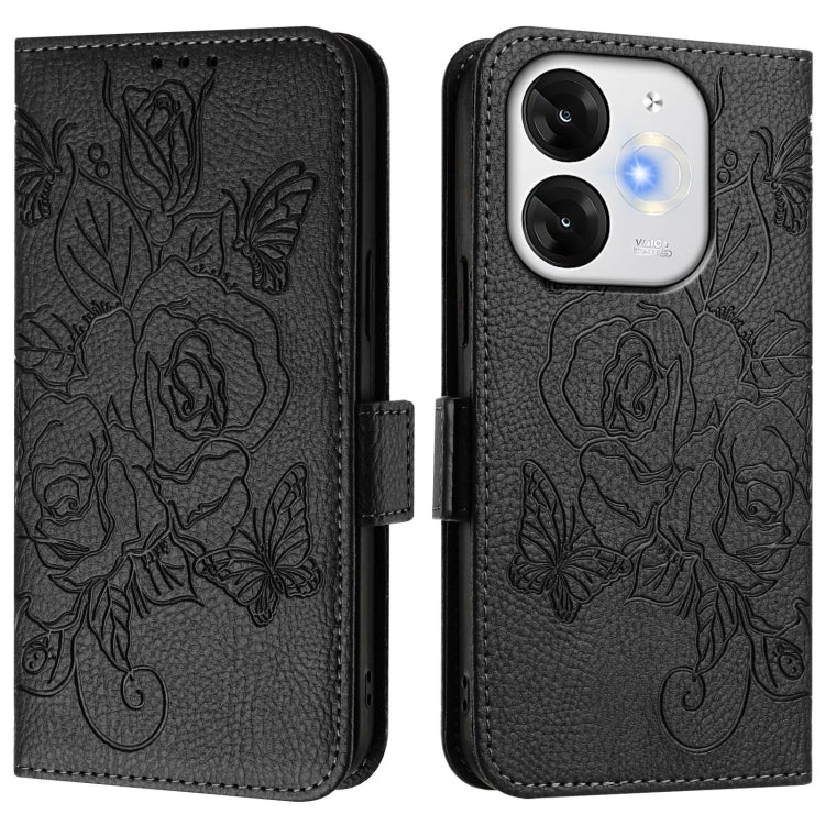 Funda de Cuero Antirrobo RFID con Relieve en Rosa para Teléfono Itel A80 4G (Negra)
