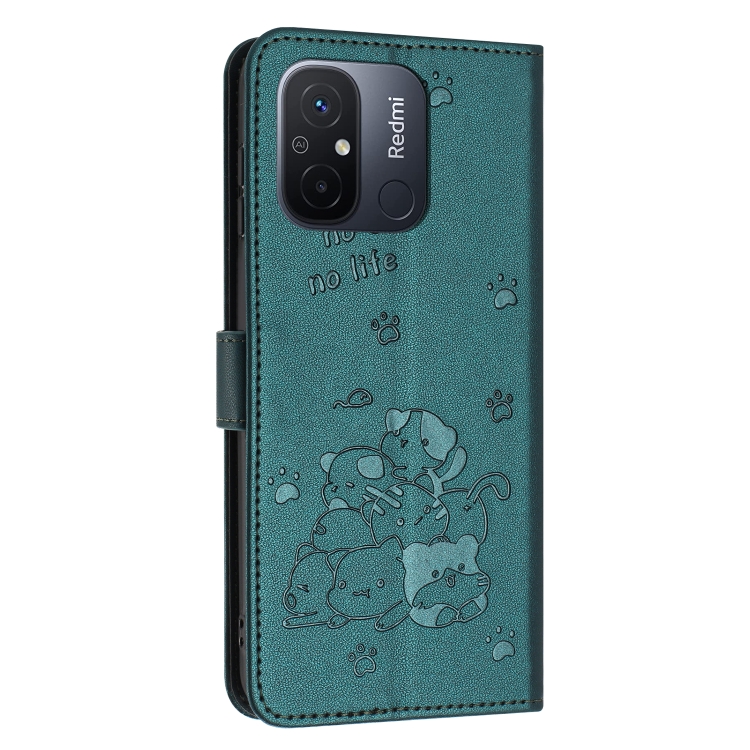 Funda de Piel con Diseño de Gatito En Relieve para Redmi 11A 4G Global con Cordón (Verde Oscuro)