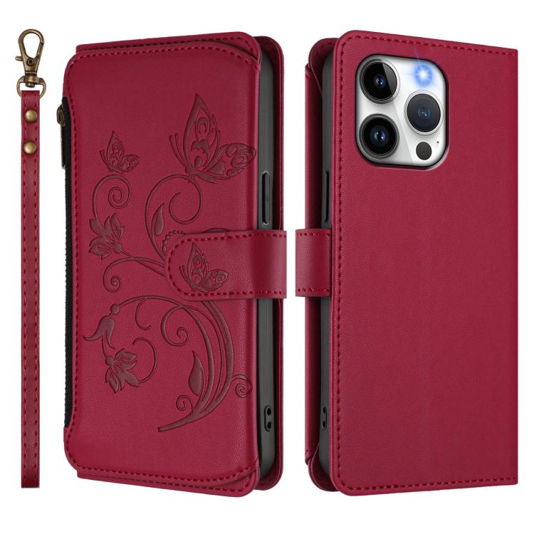 Funda de cuero con cremallera para iPhone 14 Pro, diseño de mariposas, flores y amor (rojo vino)