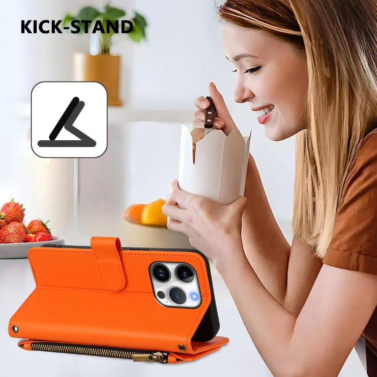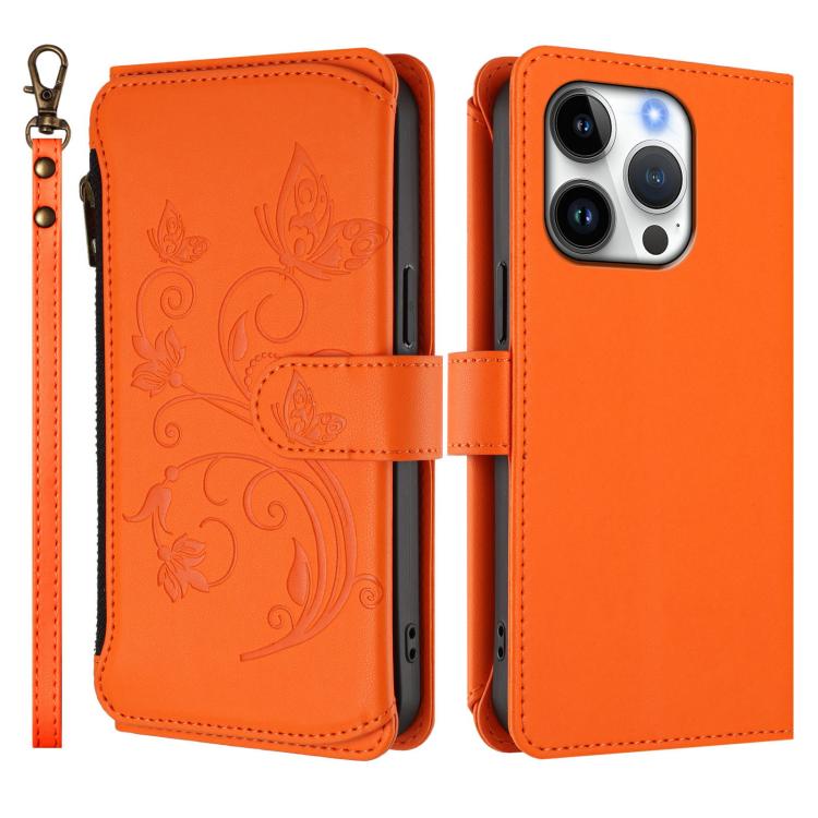 Funda de cuero con cremallera para iPhone 16 Pro Max, diseño de mariposas, flores y amor (naranja)