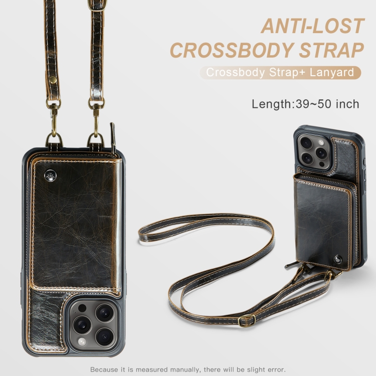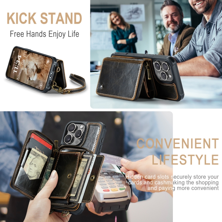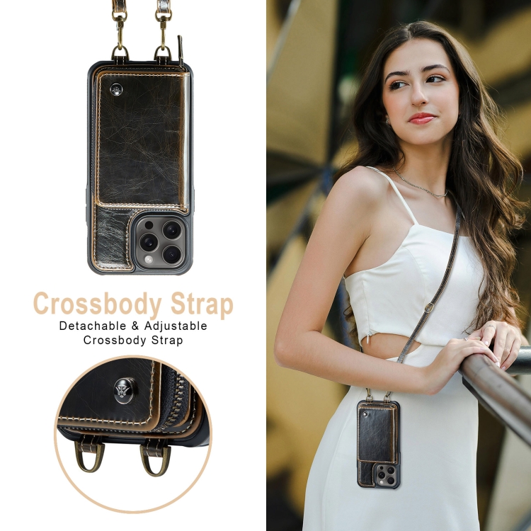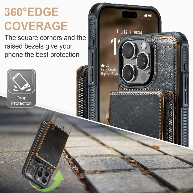 Funda de Cuero Jeehood C22 para iPhone 16 Pro Max con Cremallera y Cordón Doble (Café)