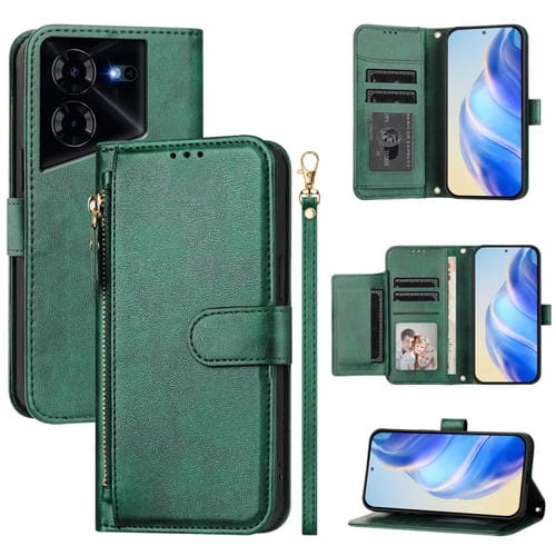 Funda de Cuero para Tecno Pova 5 Pro con Cremallera y Ranuras para Tarjetas (Verde)