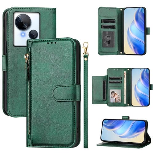 Funda de Cuero para Tecno Spark 10 5G con Cremallera y Ranuras para Tarjetas (Verde)