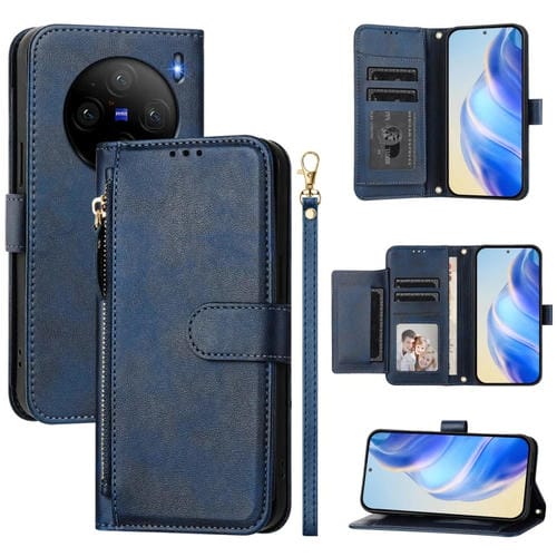 Funda de Cuero con Cremallera y Ranuras para Varias Tarjetas para Vivo X100S 5G (Azul)