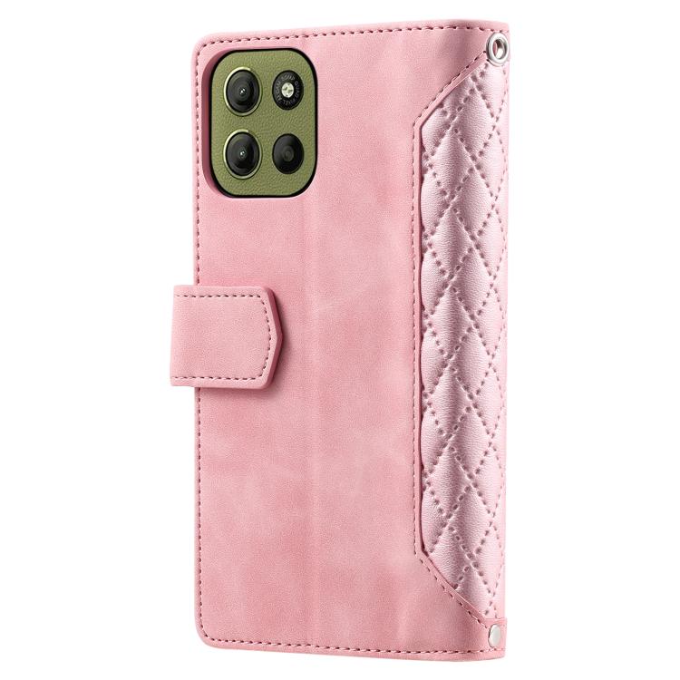 Funda de Cuero con Cremallera y Textura de Cuadrícula para Motorola Moto G15 con Cordón (Oro Rosa)