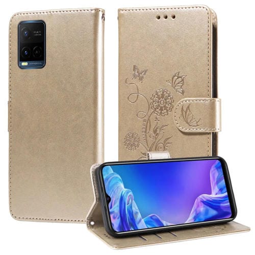 Funda de Cuero con Diseño de Mariposas En Relieve para Vivo Y21 2021 / Y21S / Y33S 4G (Dorada)