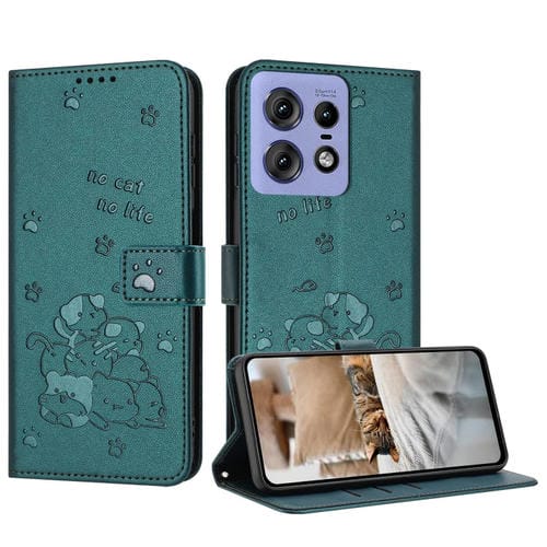 Funda de Cuero para Motorola Edge 50 Pro con Diseño de Gatito en Relieve y Cordón (Verde Oscuro)