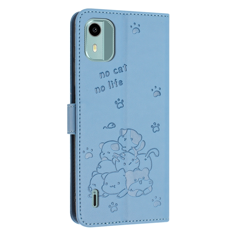 Funda de Cuero para Nokia C12 con Diseño de Gatito En Relieve y Cordón (Azul)