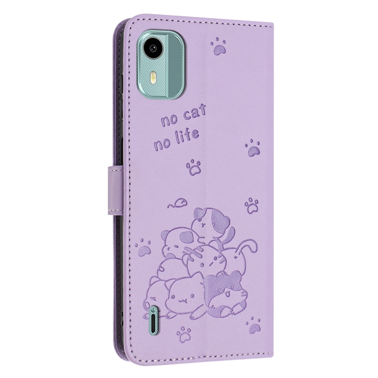 Funda de Cuero para Nokia C12 con Diseño de Gatito en Relieve y Cordón (Morado)