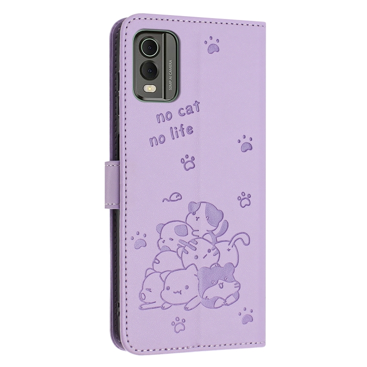 Funda de Cuero para Nokia C32 con Diseño de Gatito en Relieve y Cordón (Morado)