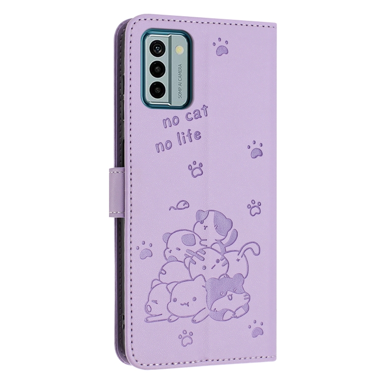 Funda de Cuero para Nokia G22 con Diseño de Gatito en Relieve y Cordón (Morado)