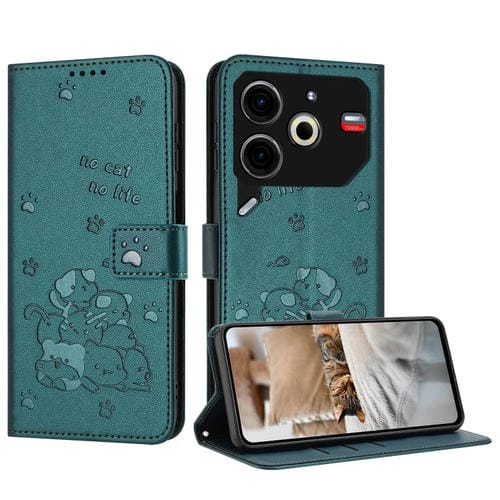 Funda de Cuero para Tecno Pova 6 Neo con Diseño de Gatito en Relieve y Cordón (Verde Oscuro)