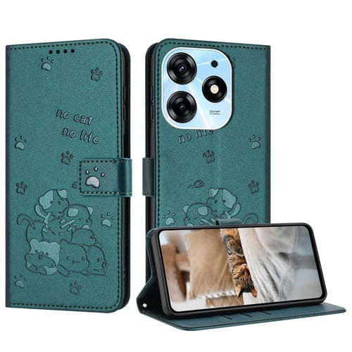 Funda de Cuero para Tecno Spark 10 Pro/K17 4G con Diseño de Gatito y Cordón (Verde Oscuro)