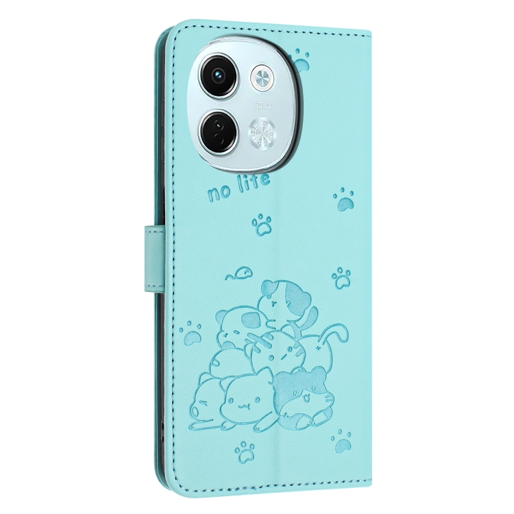 Funda de Cuero para Tecno Spark 30 5G con Diseño de Gatito en Relieve y Cordón (Verde Menta)