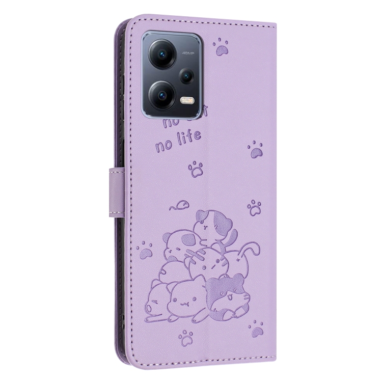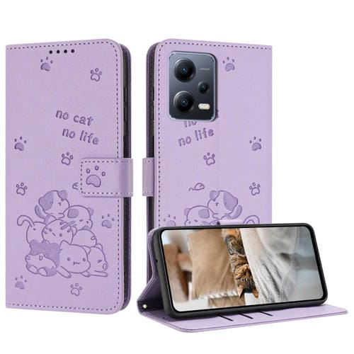 Funda de Piel con Diseño de Gatito En Relieve y Cordón para Xiaomi Poco X5 Pro 5G (Morado)