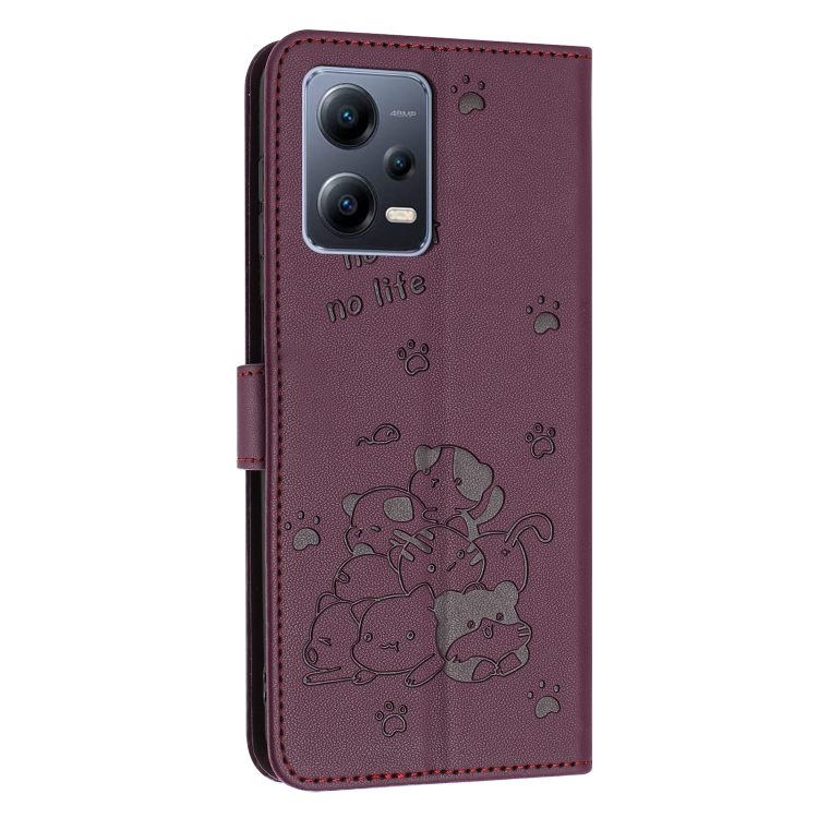 Funda de Piel con Diseño de Gatito En Relieve y Cordón para Xiaomi Poco X5 Pro 5G (Rojo Vino)
