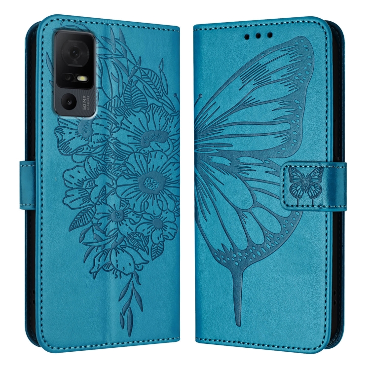 Funda de Cuero para TCL 40 XL/40 T T608Dl con Diseño de Mariposa en Relieve (Azul)