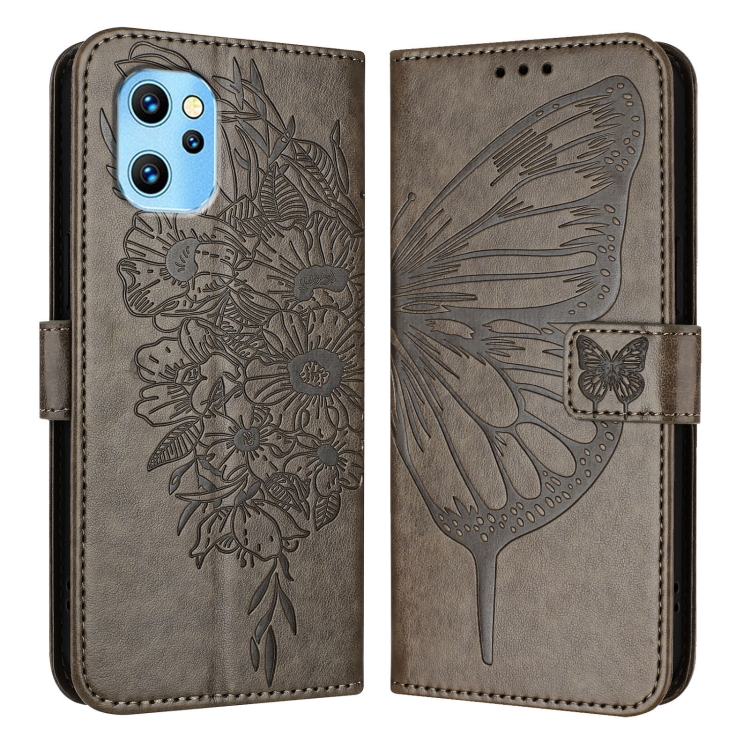 Funda de Cuero para Umidigi Power 7 Max con Diseño de Mariposa en Relieve (Gris)