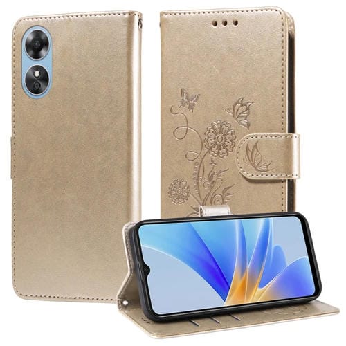 Funda de Cuero con Diseño de Mariposas y Flores En Relieve para Oppo A17 4G Global/A17K Global (Dorada)