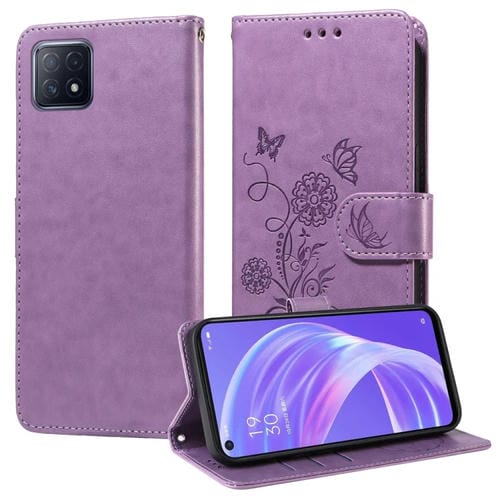 Funda de Cuero con Diseño de Mariposas y Flores En Relieve para Oppo A92S/A53 5G/A72 5G/A73 5G (Morado)