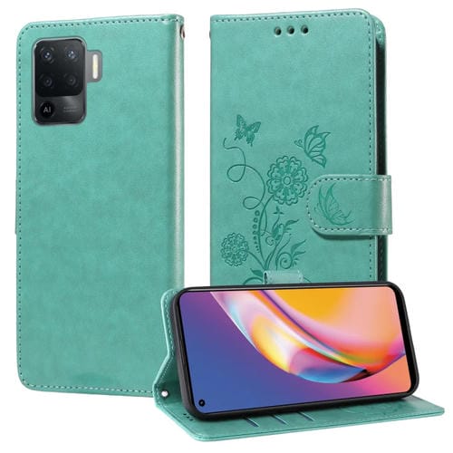 Funda de Cuero con Diseño de Mariposas y Flores En Relieve para Oppo A94 4G/5G/A95 5G/F19 Pro (Verde)