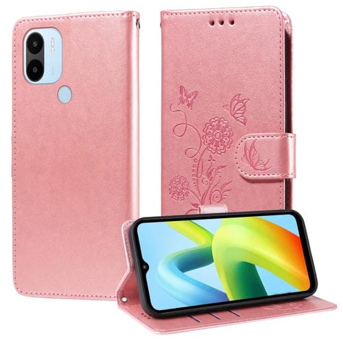 Funda de Cuero con Diseño de Mariposas y Flores En Relieve para Redmi A1 Plus/A2 Plus (Oro Rosa)