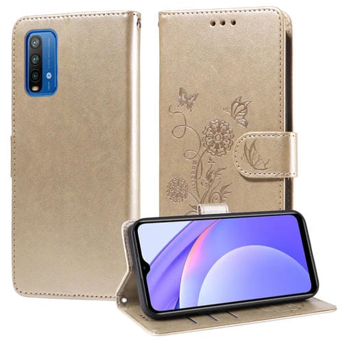 Funda de Cuero con Diseño de Mariposas y Flores En Relieve para Redmi Note 9 4G/10X 4G (Dorada)