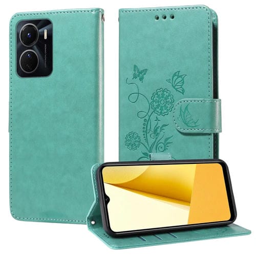 Funda de Cuero con Diseño de Mariposas y Flores En Relieve para Vivo Y16 4G / Y02S / Y56 5G (Verde)