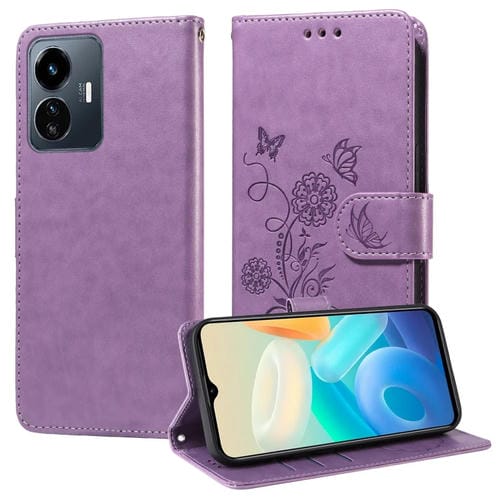 Funda de Cuero con Diseño de Mariposas y Flores En Relieve para Vivo Y77 5G (Morado)
