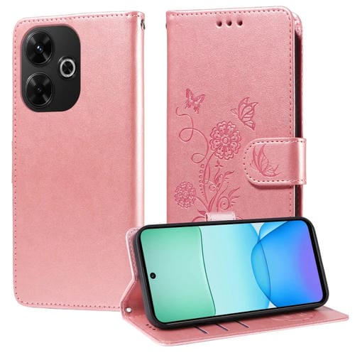 Funda de Cuero con Diseño de Mariposas y Flores En Relieve para Xiaomi Poco M6 4G (Oro Rosa)