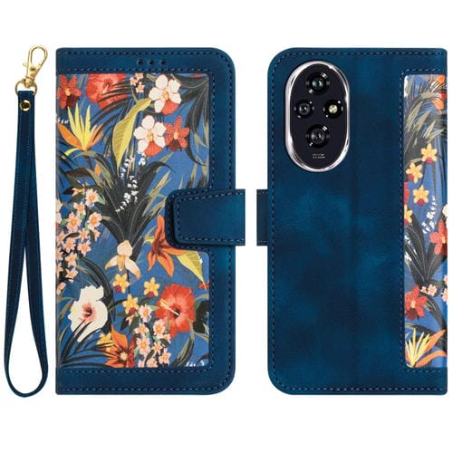 Funda de Cuero con Estampado Floral y Cordón para Honor 200 Pro (Azul Oscuro)