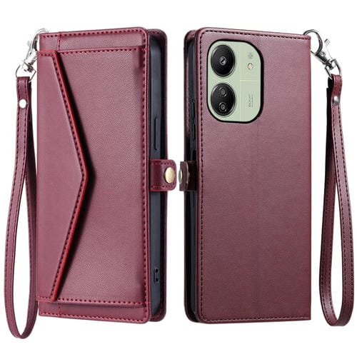 Funda de Cuero con Ranura para Múltiples Tarjetas y Cordón para Redmi 13C 4G/5G (Rojo Vino)