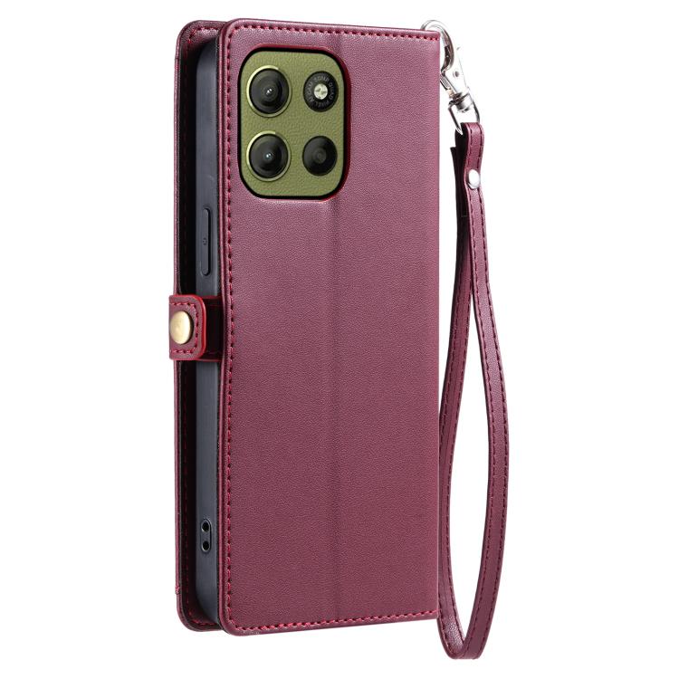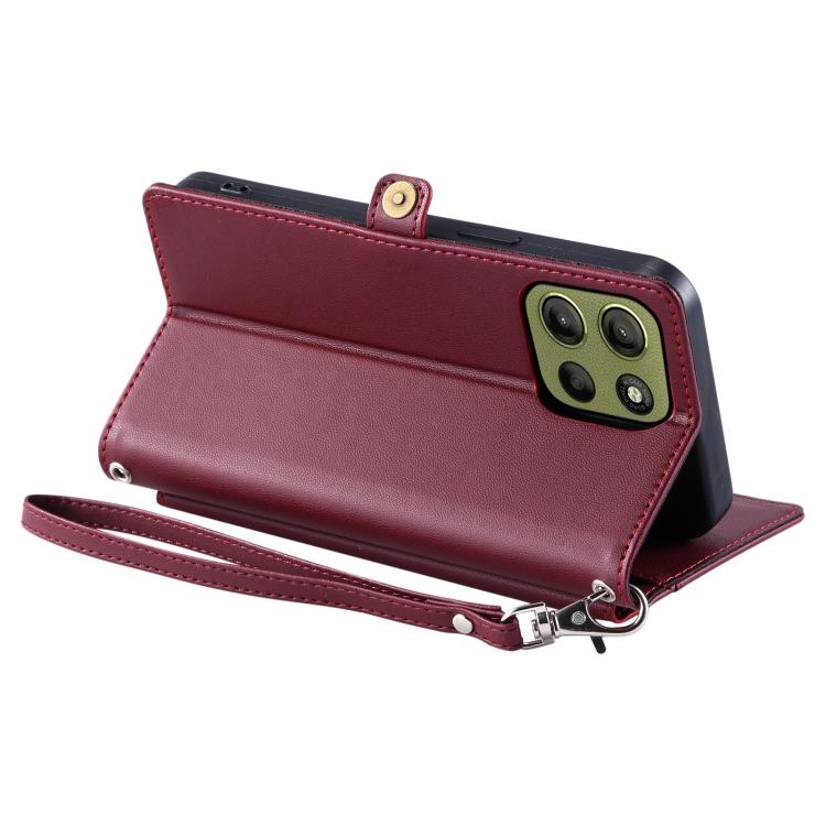 Funda de Cuero para Motorola Moto G15 con Ranura para Tarjetas y Cordón (Rojo Vino)