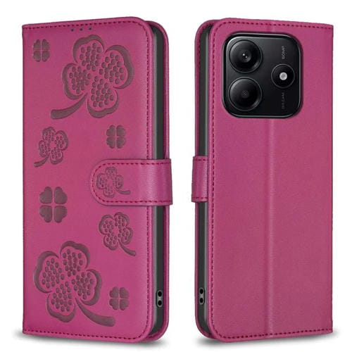 Funda de Cuero con Relieve de Cuatro Hojas para Redmi Note 14 4G (Rosa Roja)