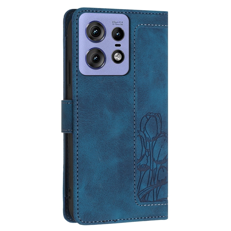 Funda de Cuero con Relieve de Tulipanes para Motorola Edge 50 Pro con Cordón (Azul)