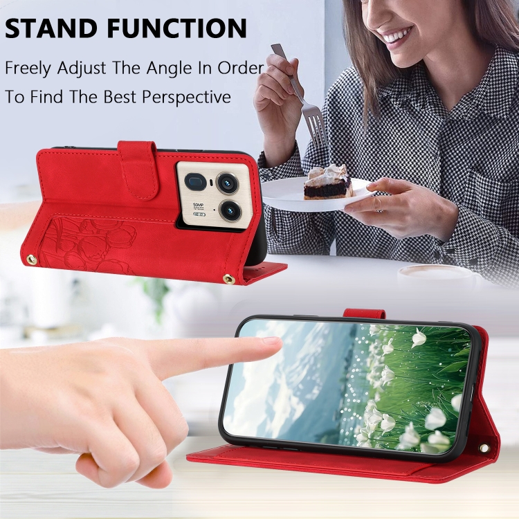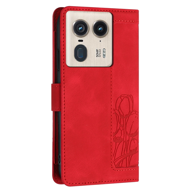 Funda de Cuero con Relieve de Tulipanes para Motorola Edge 50 Ultra con Cordón (Rojo)
