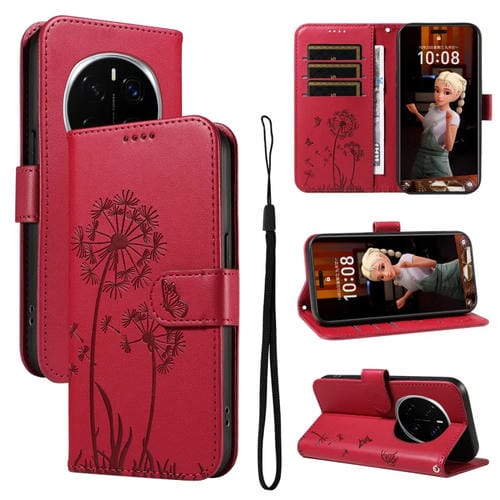 Funda de Cuero con Tapa y Estampado Diente de León en Relieve para Honor Magic7 Pro (Roja)
