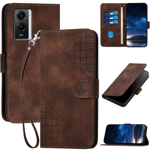 Funda de Cuero con Tapa y Cordón para Vivo Iqoo U5E 5G / Y30 5G Yx0080 con Diseño En Relieve de Mariposa y Cuadrícula (Café)