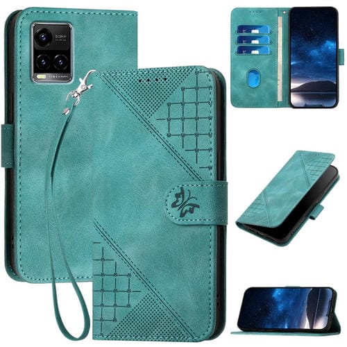 Funda de Cuero con Tapa y Cordón para Vivo Y21S/Y21T Yx0080 con Diseño En Relieve de Mariposa y Cuadrícula (Azul Claro)