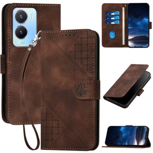 Funda de Cuero con Tapa y Cordón para Vivo Y56 5G Global Yx0080 con Diseño En Relieve de Mariposas y Cuadrícula (Café)