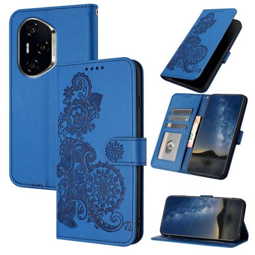 Funda de Cuero con Tapa y Flor de Datura en Relieve para Honor 300 Pro y 300 Ultra (Azul)